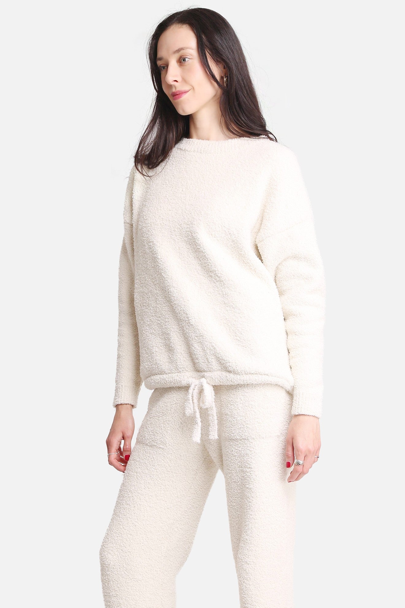 Indulge in all-day comfort with this premium lounge sweater, featuring a plush, velvety texture for a gentle feel against the skin. The adjustable drawstring at the hem enhances the fit, allowing you to achieve a tailored or relaxed silhouette.