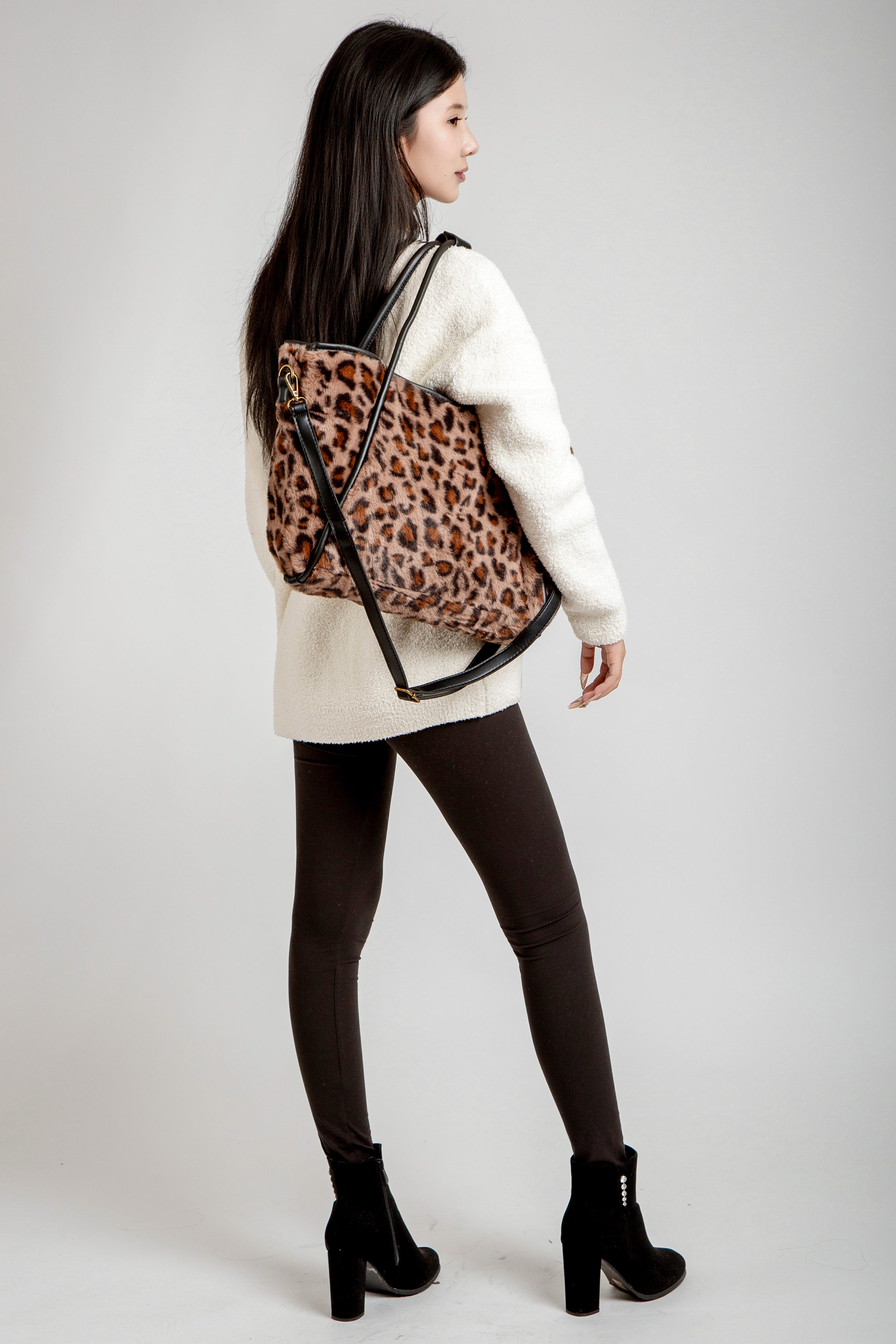 LEOPARD PATTERN FAUX FUR TOTE BAG W/ ZIPPER CLOSURE