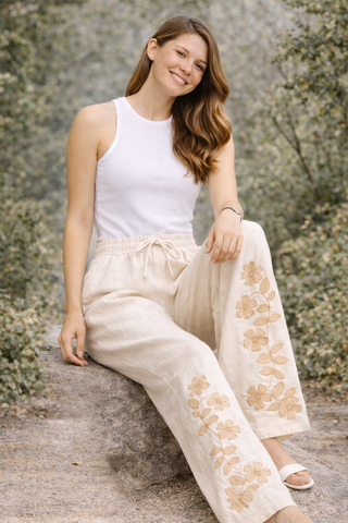Linen Floral Pattern Embroidered Wide-Leg Pants W/ Drawstring & Pockets