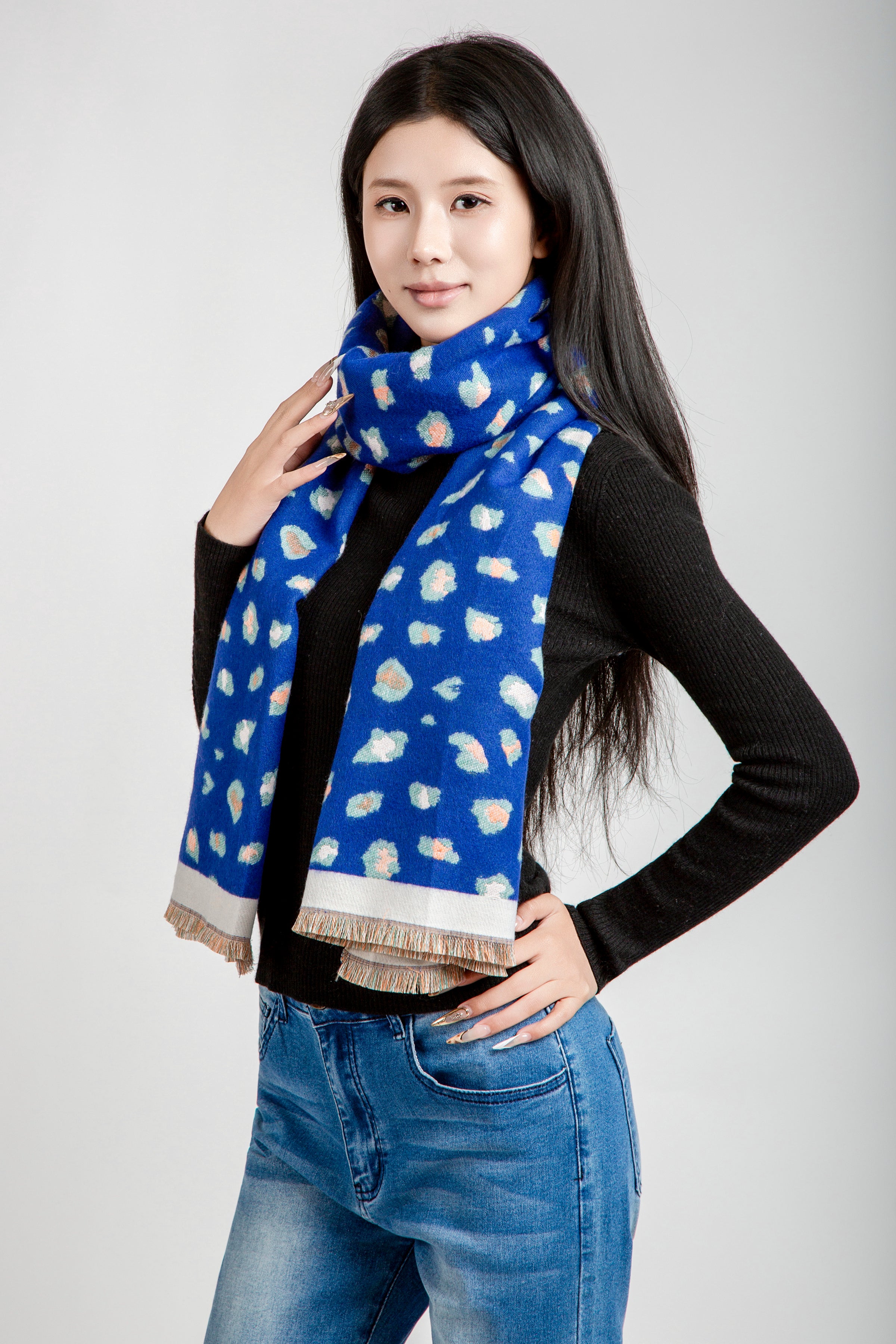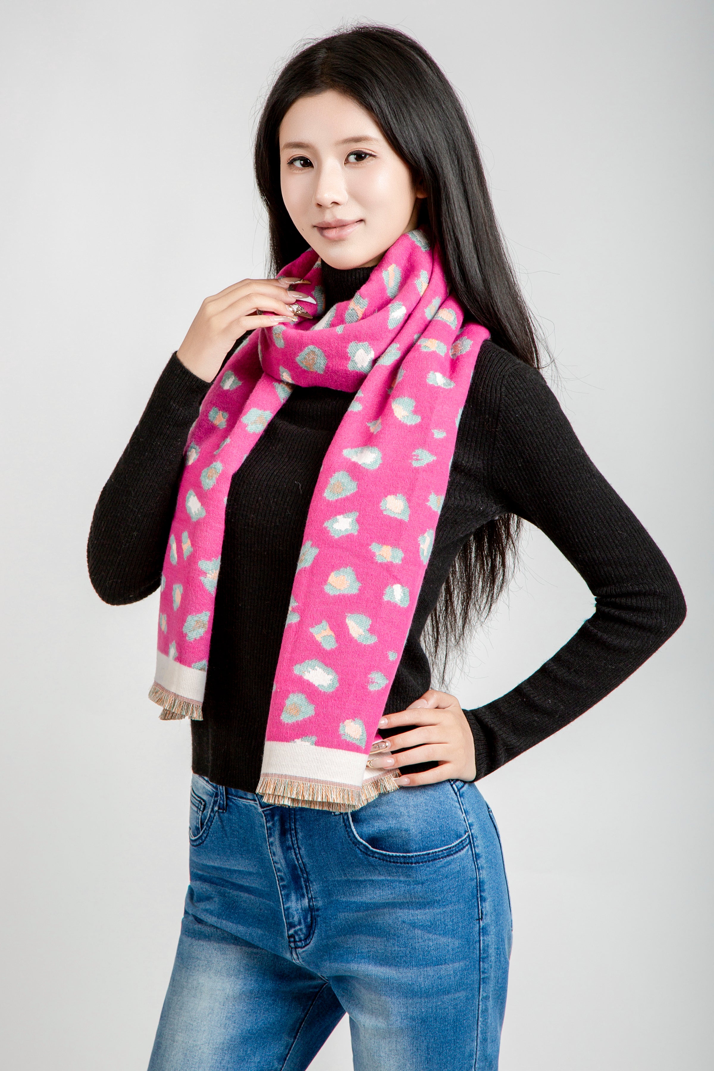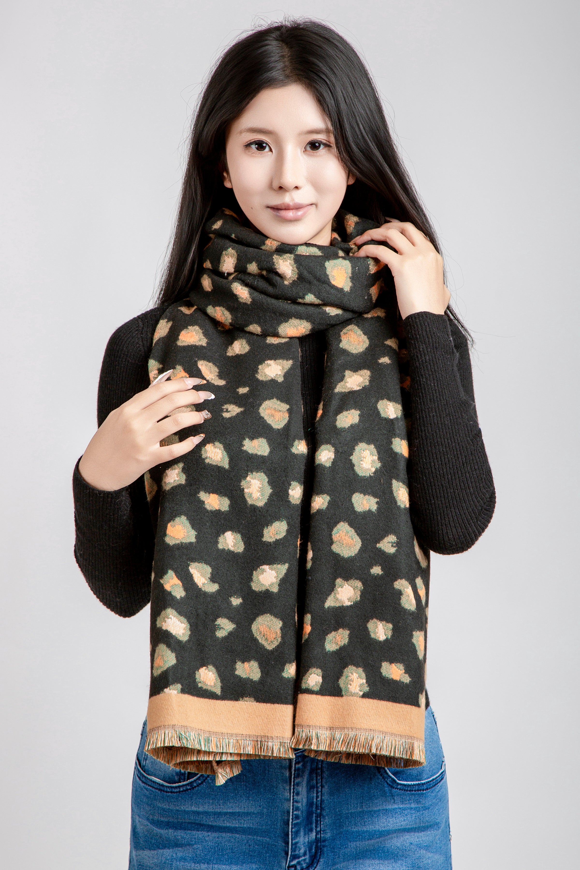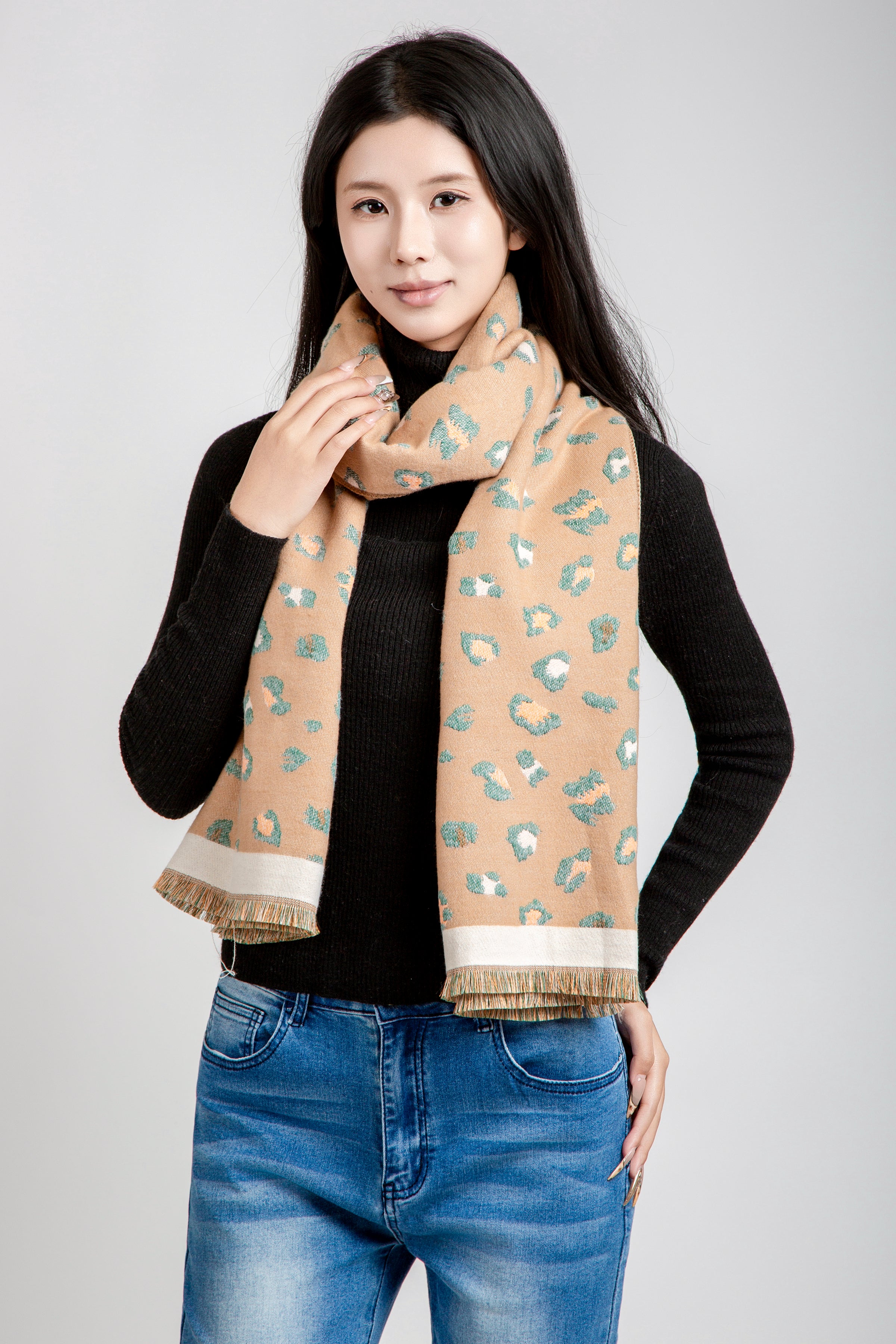 LEOPARD PATTERN OBLONG SCARF W/ TRIM