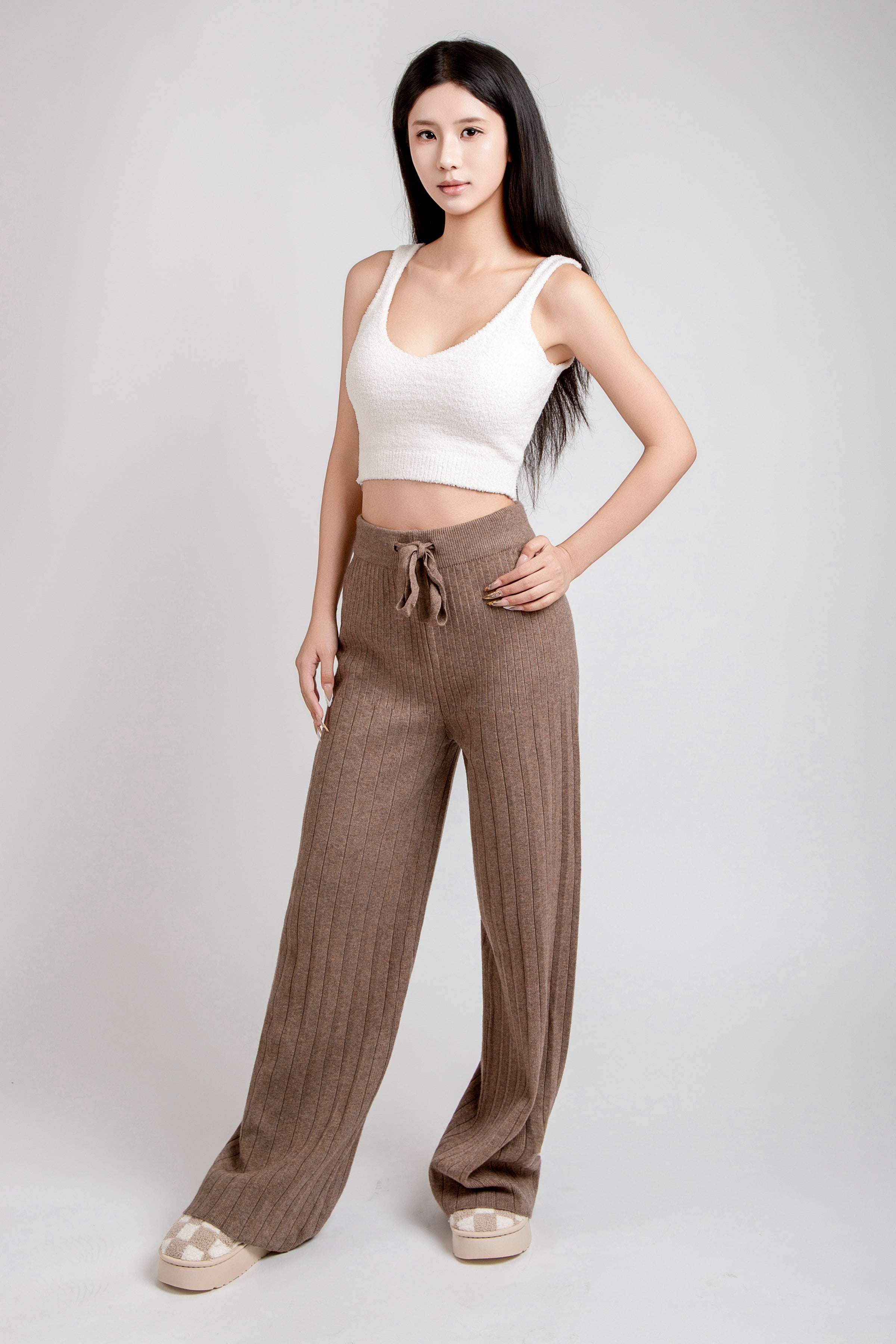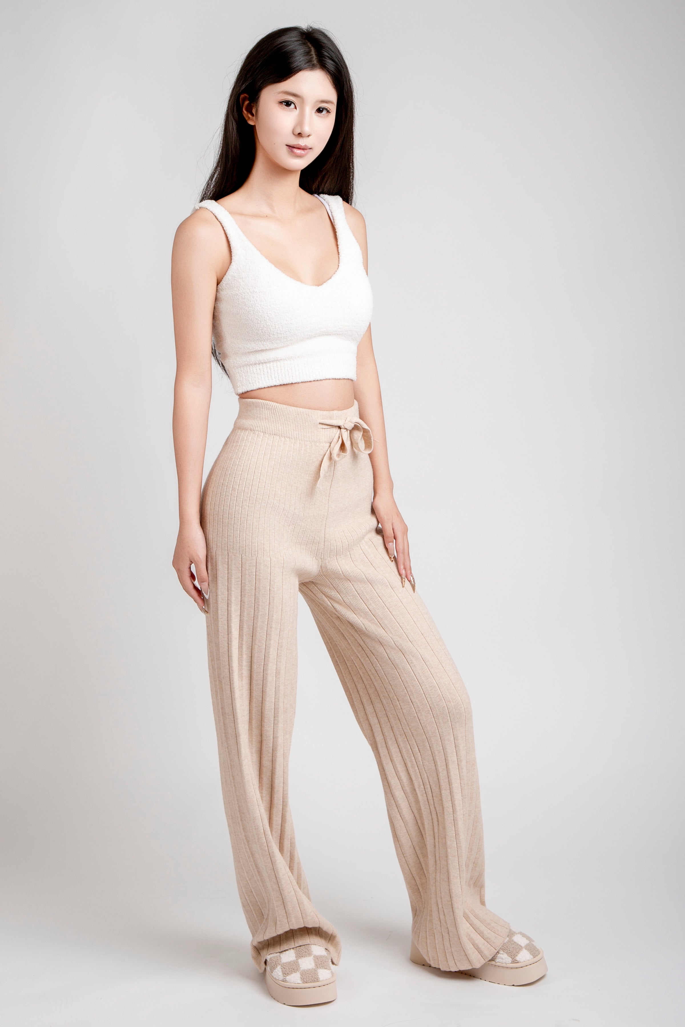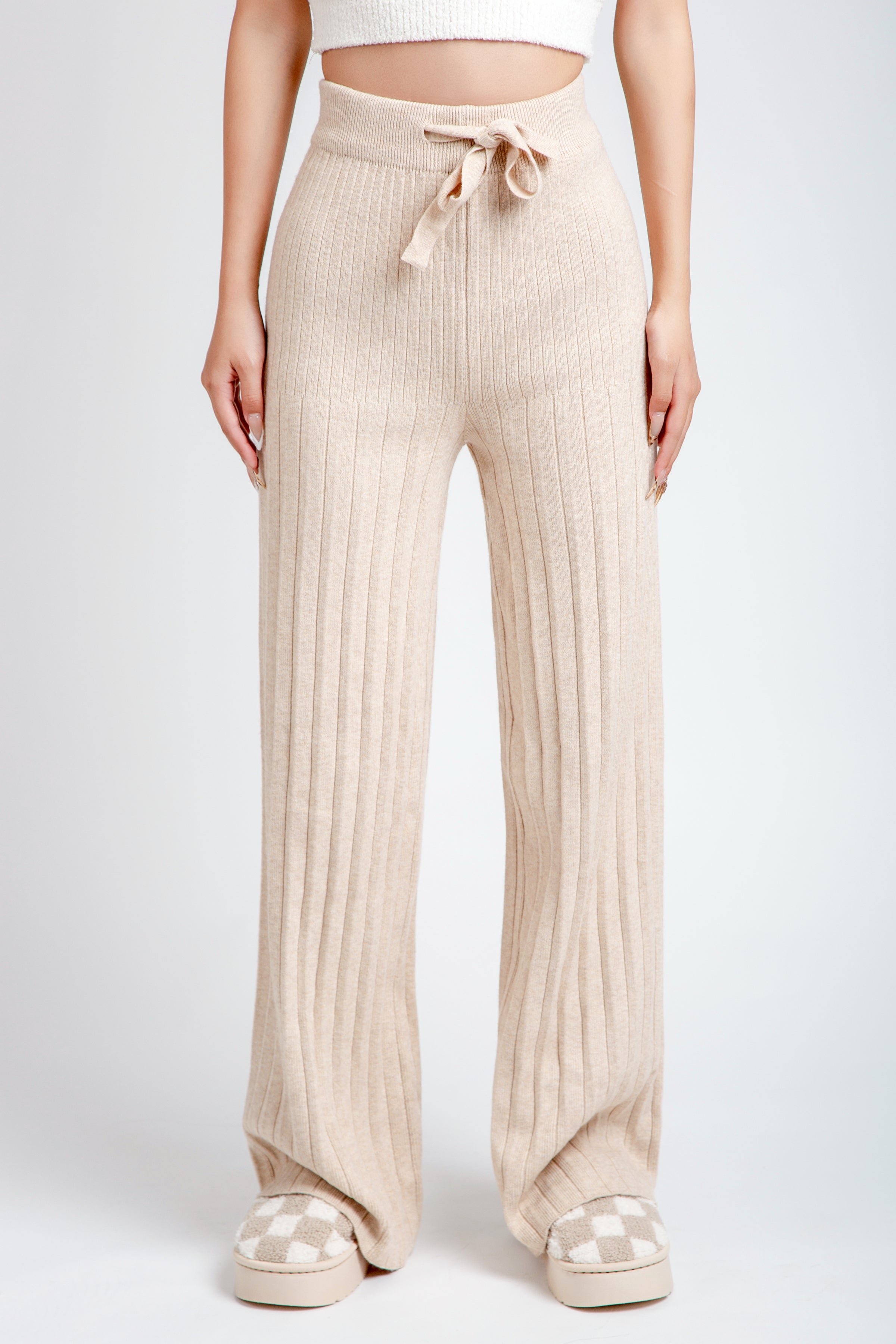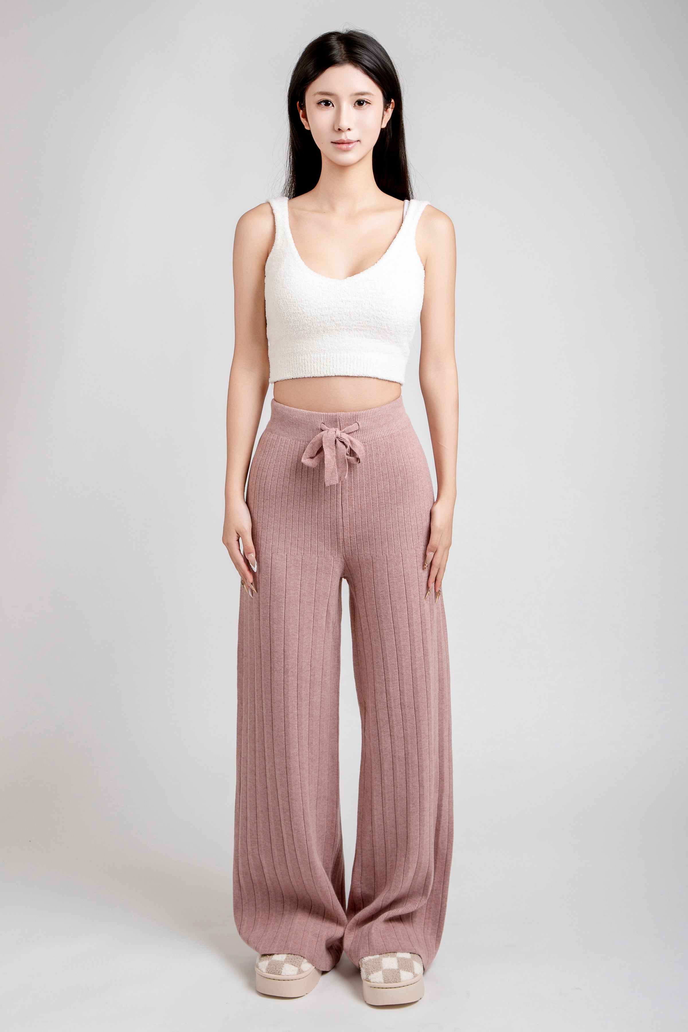 SOLID COLOR RIBBED WIDE-LEG LOUNGE PANTS W/ DRAWSTRING